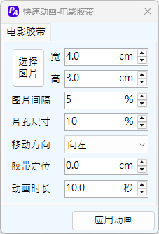 可以设定图片的大小以及图片间隔和片孔尺寸,图片间距与片孔尺寸以图片尺寸为基准,按百分比设定。当向左,向右动画设置时,胶带定位指胶带顶边距离幻灯片顶边距离;当向上,向下动画设置时,胶带定位指胶带左边距离幻灯片左边距离。
