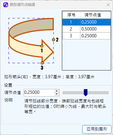 打开图形精调功能,界面如左侧,当选择的图形支持调节点调整时,程序将读取该图形当前的调节点值。程序界面展示的图形样式以及调节点位置为PPT内置的初始值的状态,仅作示意,不会随着调节点值的变化而改变形状。