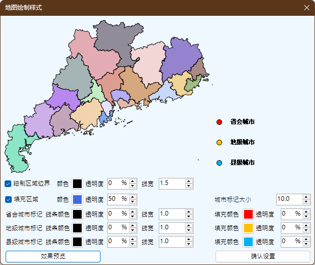 地图样式以广东省地级地图区划为样式,通过效果预览可查看当前设置下的地图绘制效果。如已设置了随机填充颜色,那么对于填充区域的颜色设置将不再有效,但透明度设置仍然生效。完成设置后,必须通过确认设置来关闭窗口,否则当前的设置不会被应用到地图绘制,仍将以之前的设置绘制地图。