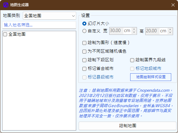 程序首次开启地图功能时,会将地图文件读入到内存中。地图类型分为4大类型全国地图、省级区划、地级区划以及世界地图四类。右侧为绘制地图的设置,包括: